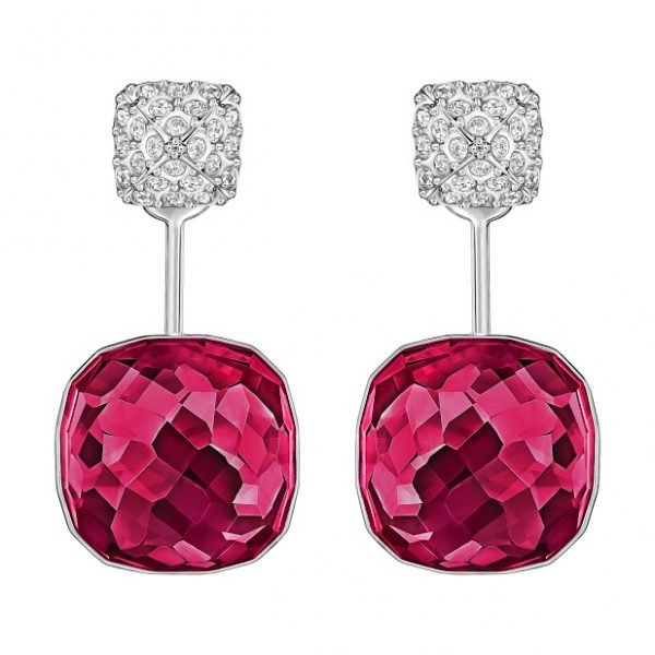 Estos aros color rojo intenso ($79.990) con cristal pavé transparente y baño de rodio miden 2 cm de largo y son perfectos para combinarlos con vestidos de noche en ocasiones más elegantes .
