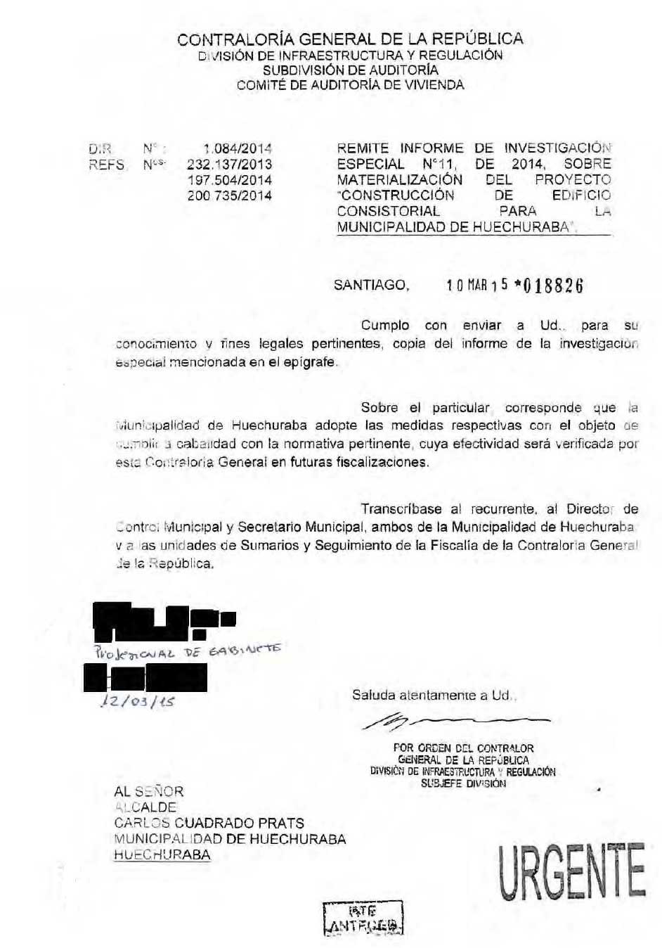 Finalmente, la Contraloría General de la República emitió un el informe de investigación especial N°11 de 2104 y que fue remitido al alcalde de Huechuraba con fecha del 10 de marzo de 2015 y establece: