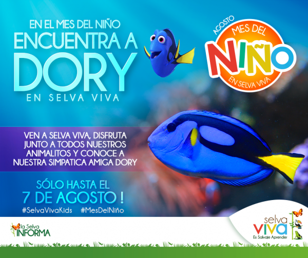 “Los que estén buscando a Dory, la famosa amiga de Nemo, la van a encontrar aquí en Selva Viva, para que vengan a conocerla en vivo y en directo el Día del Niño”, indica Alfredo Ugarte, director científico del lugar, quien se entusiasma a la hora de pensar que muchos pequeños visitarán este lugar el domingo 7 de enero. Dory es un pez de intenso color azul llamado cirujano regal (Paracanthurus hepatus) que está junto al famoso pez payaso del cine llamado Nemo (Amphiprion ocellaris) y se proyecta como una de las mayores novedades.