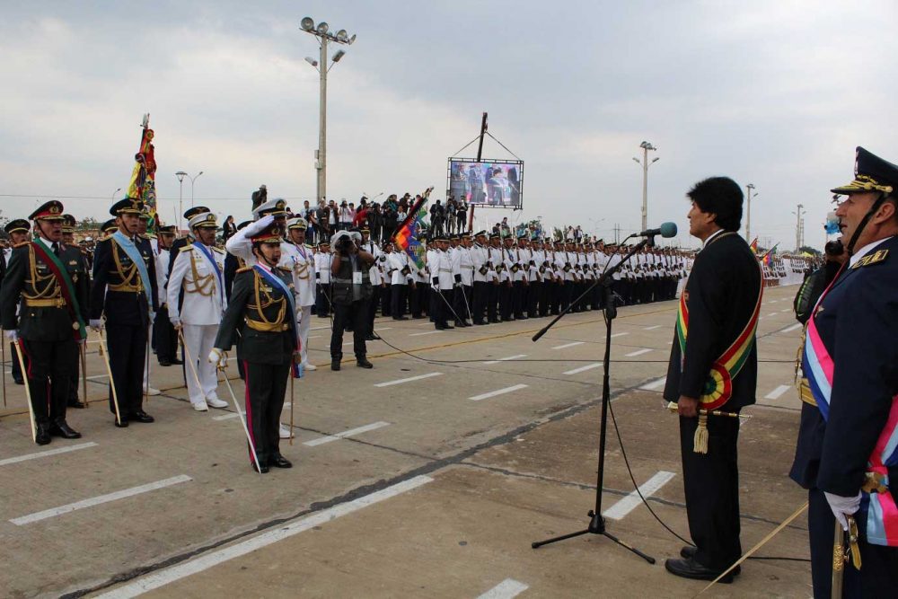 Este domingo el Presidente de Bolivia, Evo Morales, encabezó la conmemoración del 206° aniversario del Ejército boliviano realizado en el «Cambódromo» de la ciudad de Santa Cruz de La Sierra y aseguró que: «Estoy convencido que la garantía de la soberanía económica, soberanía de los recursos naturales está en manos de las FFAA y los movimientos sociales, como una yunta para defender los intereses de la patria».