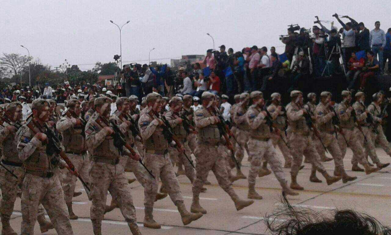 El desfile militar contó con la participación de las tres ramas: Ejército, Armada y Fuerza Aérea, y desfilaron los nuevos blindados donados por China.