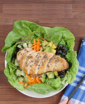 El pepino elimina las toxinas del sistema digestivo, los arándanos ayudan a combatir la grasa del abdomen, la piña acelera la digestión, el aguacate y las almendras reducen la hinchazón del vientre, el pollo es proteína y no inflama como los carbohidratos, y la lechuga te hará sentir satisfecho sin consumir muchas calorías.