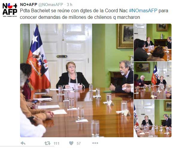 En la tarde de este miércoles el líder del movimiento «No+AFP», Luis Mesina, junto a otros dirigentes, fue recibido en el Palacio de Gobierno por la Presidenta Michelle Bachelet, a quien le plantearon la necesidad de terminar con el actual sistema. Recordemos que La Moneda ha propiciado un diálogo que busca reformar el sistema pero no cambiarlo.