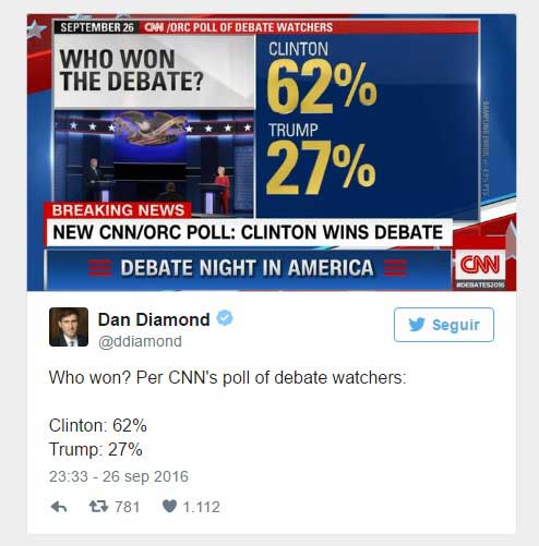 La ex secretaria de Estado obtuvo una victoria según el 62 % de los encuestados por la cadena CNN, que en su mayoría eran demócratas, mientras que un 27% respondió que fue el magnate el que se impuso en el cara a cara celebrado en la Universidad de Hofstra (Nueva York).