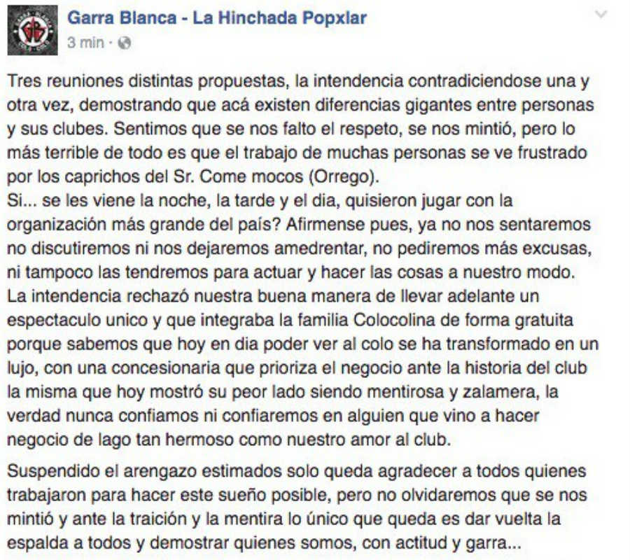 «La intendencia rechazó nuestra buena manera de llevar adelante un espectaculo único y que integraba la familia colocolina de forma gratuita. Suspendido el arengazo estimados sólo queda agradecer a todos quienes trabajaron para hacer este sueño posible, pero no olvidaremos que se nos mintió y ante la traición y la mentira lo único que queda es dar vuelta la espalda a todos y demostrar quienes somos, con actitud y garra», finalizó el texto de los barristas.