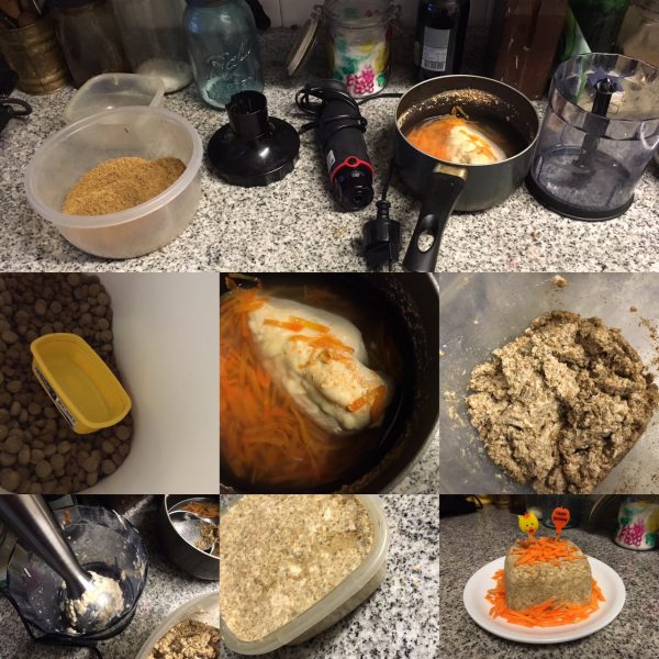 Cuando el pollo este cocido, picarlo y molerlo hasta que se forme una pasta, agregarle un poco del caldo y la zanahoria para que no quede tan seco.