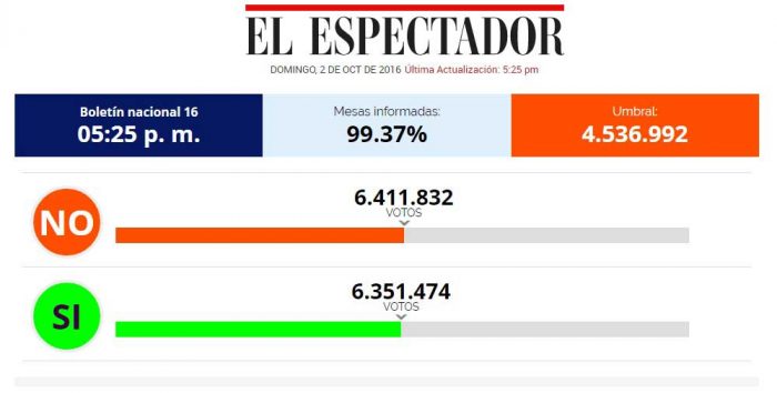El 2 de octubre de 2016 queda inmortalizado desde hoy en la historia de Colombia. Este domingo, 6.419.759 ciudadanos le dijeron “No” al acuerdo de paz con las Farc, una decisión con la que el país rechazó el pacto para ponerle punto final al conflicto de 52 años con esa guerrilla.