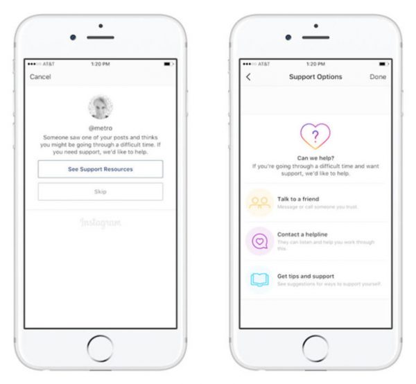 Con la nueva herramienta, cualquier usuario que vea una imagen preocupante o acompañada de un texto del que se pueda deducir que la persona está pensando en el suicidio o la autolesión podrá informar a Instagram de ello. Entonces, la red social enviará un mensaje al usuario que lo ha publicado: «Alguien ha visto uno de tus posts y ha pensado que puedes estar pasando por un momento difícil. Si necesitas apoyo, estamos aquí para ayudarte». Y le dará a elegir entre tres opciones: contactar con un amigo, llamar a una línea de ayuda o recibir algunos consejos en la propia pantalla.
