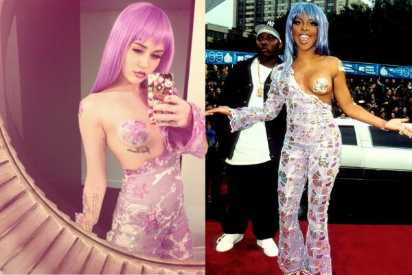 Miley Cyrus se disfrazó en 2013 de la cantante Lil Kim. La autora de ‘Wrecking ball’ eligió un modelo que su ídola lució en la gala de los premios MTV de 1999, un traje de una sola pieza que dejaba al descubierto un pecho. Eso sí, tapado por una flor de pegatina.