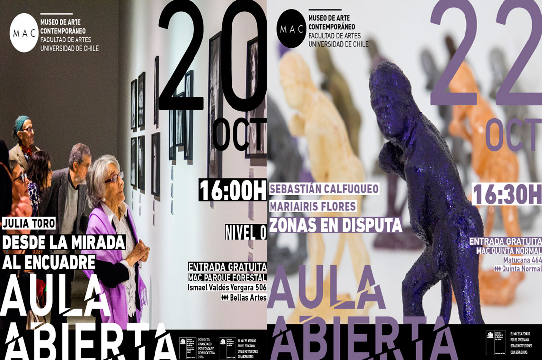 El Museo de Arte Contemporáneo presenta dos Aulas Abiertas de los artistas Julia Toro y Sebastián Calfuqueo, el 20 y 22 de octubre respectivamente. A propósito de sus exhibiciones en el museo, ambos autores compartirán con el público, en torno a sus experiencias y las creaciones de sus trabajos.