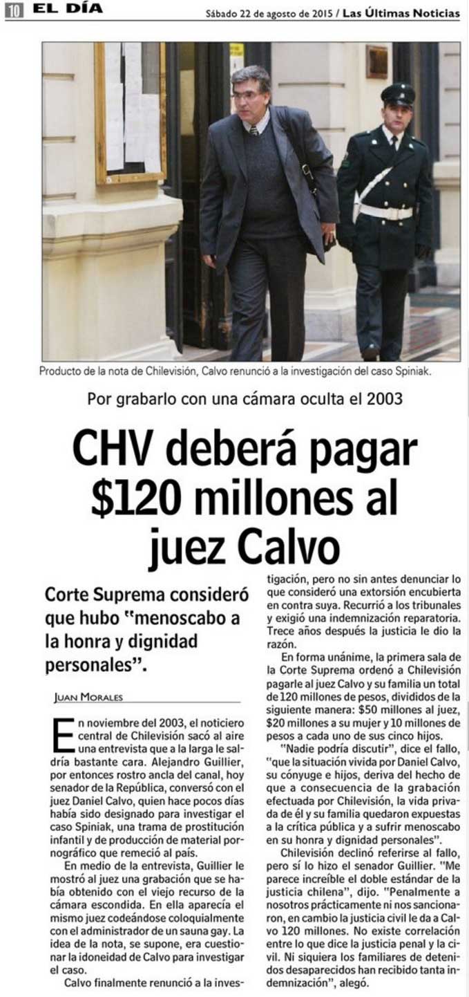 El 9 de agosto de 2007, el hoy flamante candidato, fue absuelto por el uso de cámaras ocultas, así lo publicó EMOL: «Absuelven a Alejandro Guillier por grabación oculta al juez Daniel Calvo. También fue absuelto de los cargos por extorsión el ex regente del sauna gay donde concurría el magistrado, Sebastián Rodríguez, quien sí mantuvo su condena por las grabaciones en el despacho del juez. SANTIAGO.- Esta mañana, la Segunda Sala de la Corte Suprema decidió absolver al periodista de Chilevisión, Alejandro Guillier, en el caso de la grabación oculta al ex ministro del Caso Spiniak, Daniel Calvo».