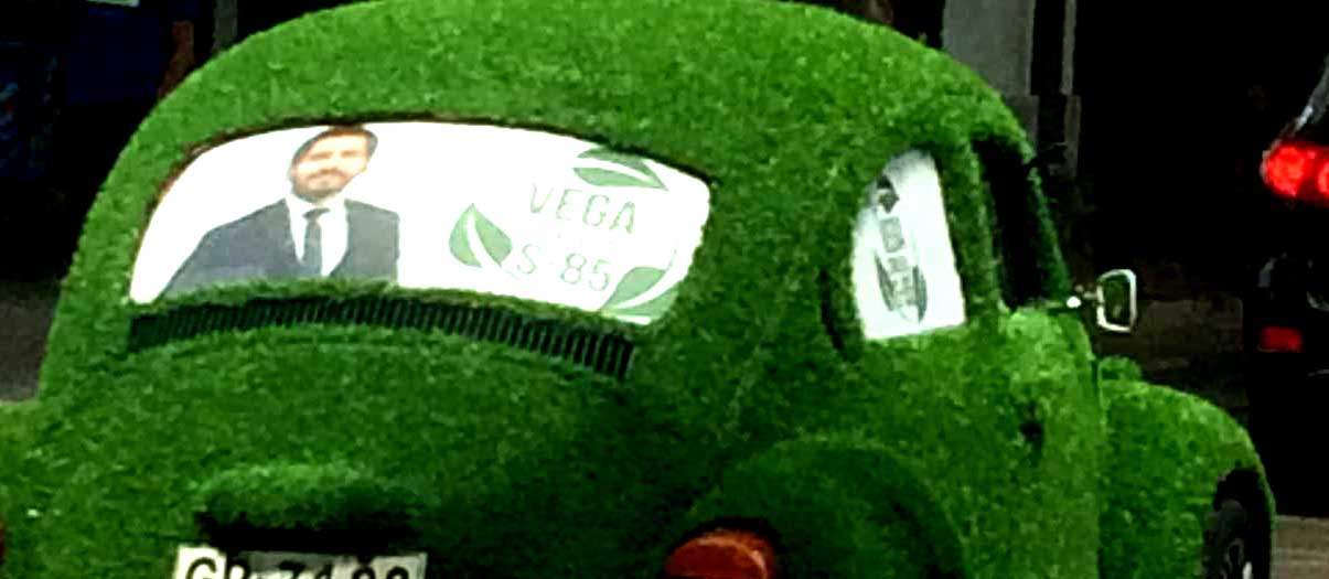 En tanto, en Santiago Centro, llamó la atención el recorrido que hacía un escarabajo cubierto de pasto, una llamativa forma de promocionar a un candidato a concejal.