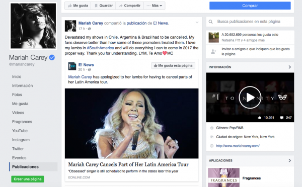 “Devastada, mis shows en Chile, Argentina y Brasil debieron ser cancelados (…) haré todo lo posible por venir de manera adecuada en 2017”, dijo Mariah a sus fan a a a través de sus redes sociales.