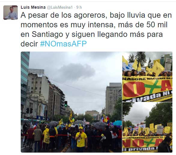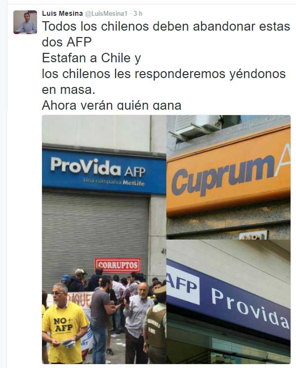 “Queremos anunciar la segunda fase de la campaña (…) Mañana comienza la fuga masiva de Provida y Cuprum de todos los chilenos. Estas dos AFP estafaron a todos los chilenos con la evasión tributaria en más de 420 millones de dólares”, señaló al cierre de la marcha el líder y vocero del movimiento, Luis Mesina, y justificó el llamado a un retiro masivo de cotizantes de las AFP Cuprum y Provida, que debería comenzar a partir de este lunes.
