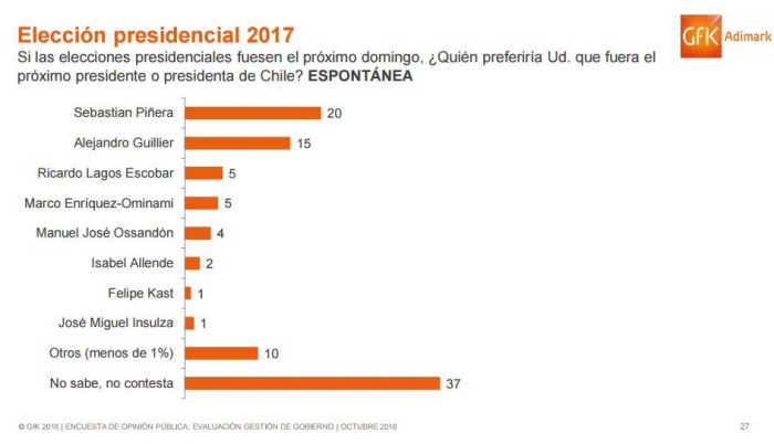 Sin duda la encuesta es un triunfazo para Alejandro Guillier que remonta 10 puntos en relación al sondeo de agosto y se estanca Lagos que no logra subir del 5%. La preferencia presidencial la lidera Sebastián Piñera con 20%. Manuel José Ossandón logra un pobre 4% mientras que Kast e Insulza sólo tienen 1%. Fernando Atria no figura en este estudio.