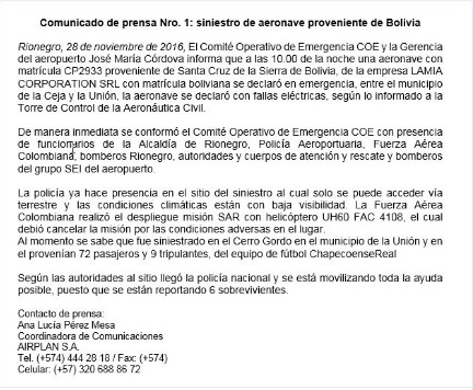 A través de comunicado Conmebol comentó que “la Confederación Sudamericana de Fútbol confirma que ha sido notificada por autoridades colombianas de que el avión en el que viajaba la delegación del Chapecoense de Brasil sufrió un accidente a su llegada a Colombia. Estamos en contacto con las autoridades y a la espera de avances oficiales”.