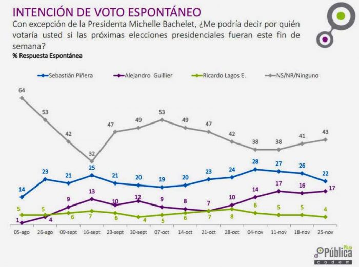 En todo caso, en círculos de la Nueva Mayoría, el comentario generalizado es que Lagos no llega a enero y que su bajada es inminente, el “tiro de gracias” será la próxima CEP que podría disparar al precandidato independiente Alejandro Guillier, que tampoco convence del todo y hoy es considerado como un candidato que no da garantías a los partidos de la Nueva Mayoría, porque no da certezas, comentan.