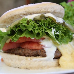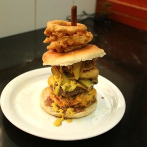 La monstruosa hamburguesa Don Simón lleva 500 gramos de carne, generoso queso cheddar, tocino, aros de cebolla, pepinillos y mostaza americana.