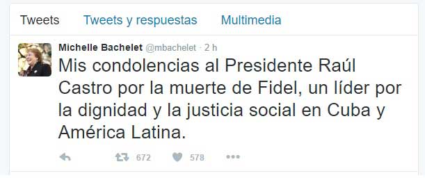 Desde Chile, la Presidenta Michelle Bachelet, a través de twitter escribió: «Mis condolencias al Presidente Raúl Castro por la muerte de Fidel, un líder por la dignidad y la justicia social en Cuba y América Latina».