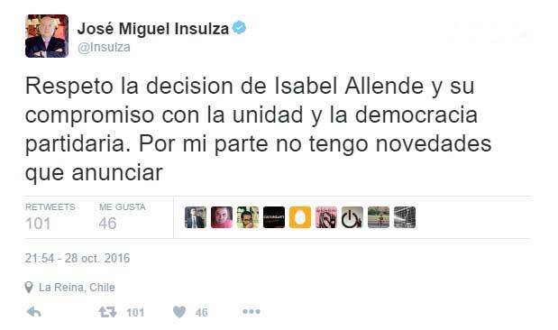 A los pocos minutos José Miguel Insulza dijo –vía twitter- “Respeto la decisión de Isabel Allende y su compromiso con la unidad y la democracia partidaria. Por mi parte no tengo novedades que anunciar” (28 octubre a las 21:54 horas).