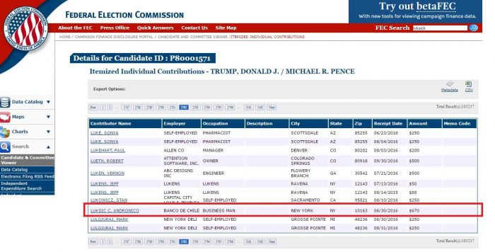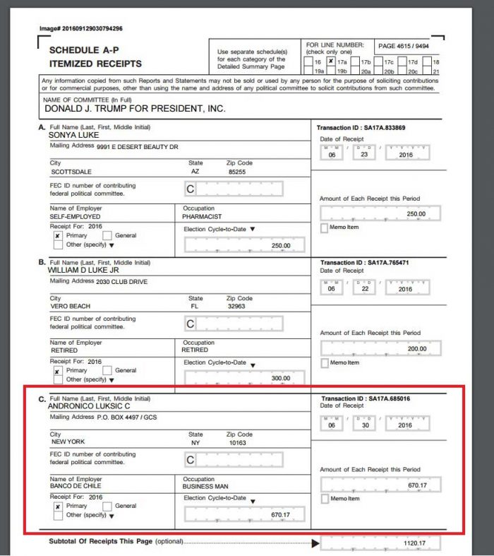 Efectivamente Luksic aparece como donante según el reporte de la página 2792: “LUKSIC C, ANDRONICO BANCO DE CHILE BUSINESS MAN NEW YORK NY 1016 06/30/2016 $670”.