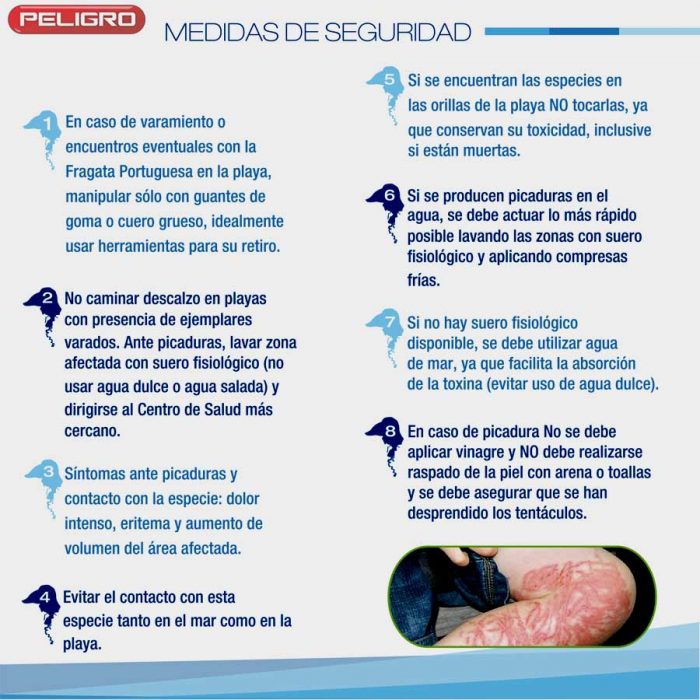 Dada la complejidad del tratamiento de esta especie, una vez que se varan, es importante reiterar las medidas de seguridad: no tomar contacto con ella, no enterrarlas en el sector de arena que baña la costa, dar aviso de inmediato a los salvavidas que estén en el balneario o contactarse con la Capitanía de Puerto correspondiente, quienes se comunicaran con la autoridad sanitaria.