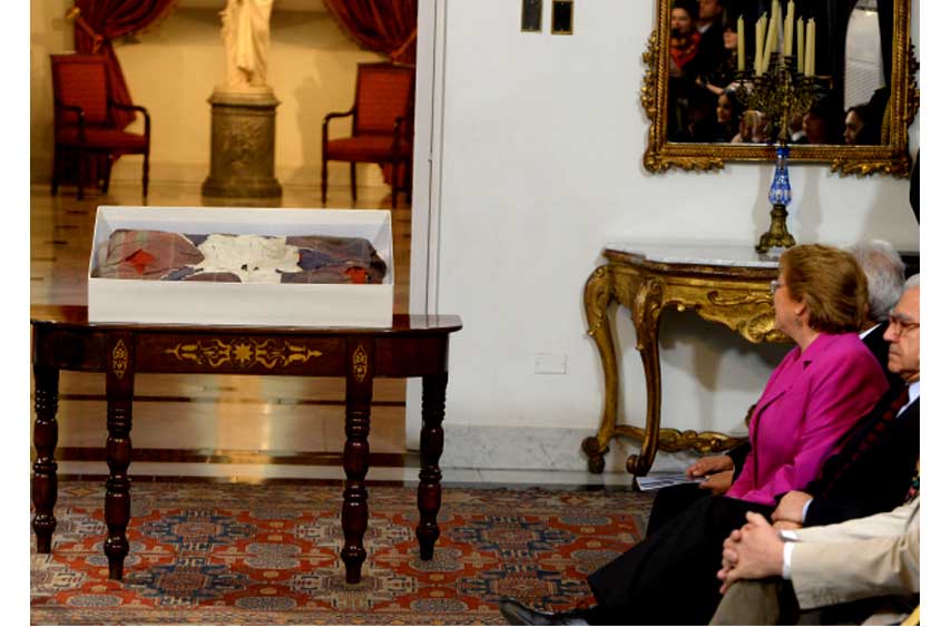 “Esta bandera, dañada por el uso, el paso del tiempo pero también por el incendio de La Moneda, fue custodiada por más de 40 años por una persona que, hace algún tiempo, la entregara al ex ministro de Tierras y Colonización del ex Presidente Salvador Allende, don Roberto Cuéllar”, señaló la Mandataria.