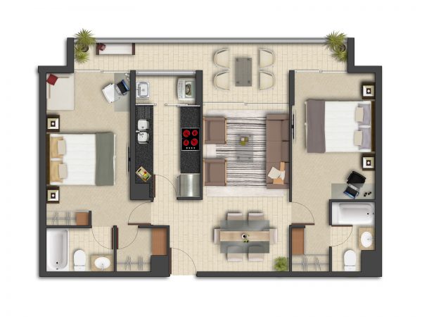 Estos departamentos son una alternativa innovadora y que hace más eficiente el aprovechamiento de la superficie al no haber pasillos de distribución en la zona de dormitorios, por lo que por la misma superficie y precio de un departamento tradicional de 2 dormitorios, uno puede disfrutar de más espacio, mejores habitaciones, un living-comedor más amplio y, lo más importante, independencia y privacidad de los ocupantes de cada habitación.
