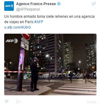 Esta noche en París, un hombre armado tomó siete rehenes en una agencia de viajes, al parecer en un intento de robo, según fuentes policiales francesas, según un cable de AFP.