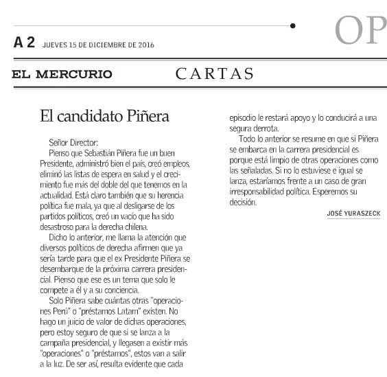 Todo lo anterior se resume en que si Piñera se embarca en la carrera presidencial es porque está limpio de otras operaciones como las señaladas. Si no lo estuviese e igual se lanza, estaríamos frente a un caso de gran irresponsabilidad política. Esperemos su decisión. José Yuraszeck”.