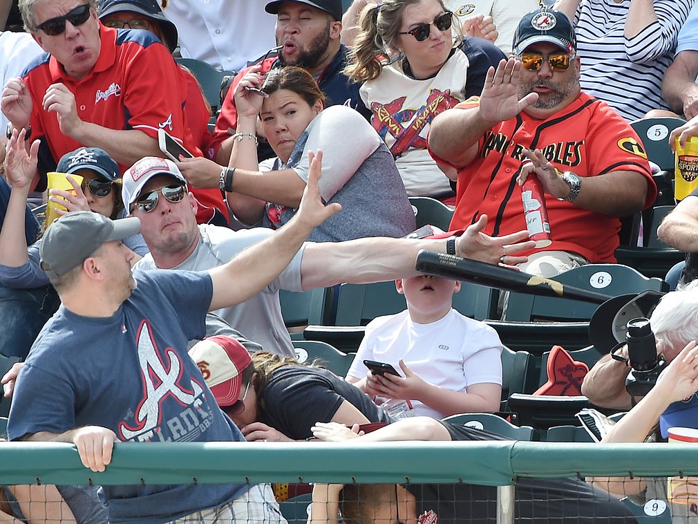 Un padre salva a su hijo de ser golpeado por un bate de beisbol del jugador Danny Ortiz durante el partido el entrenamiento en el Lake Buena Vista, Florida.