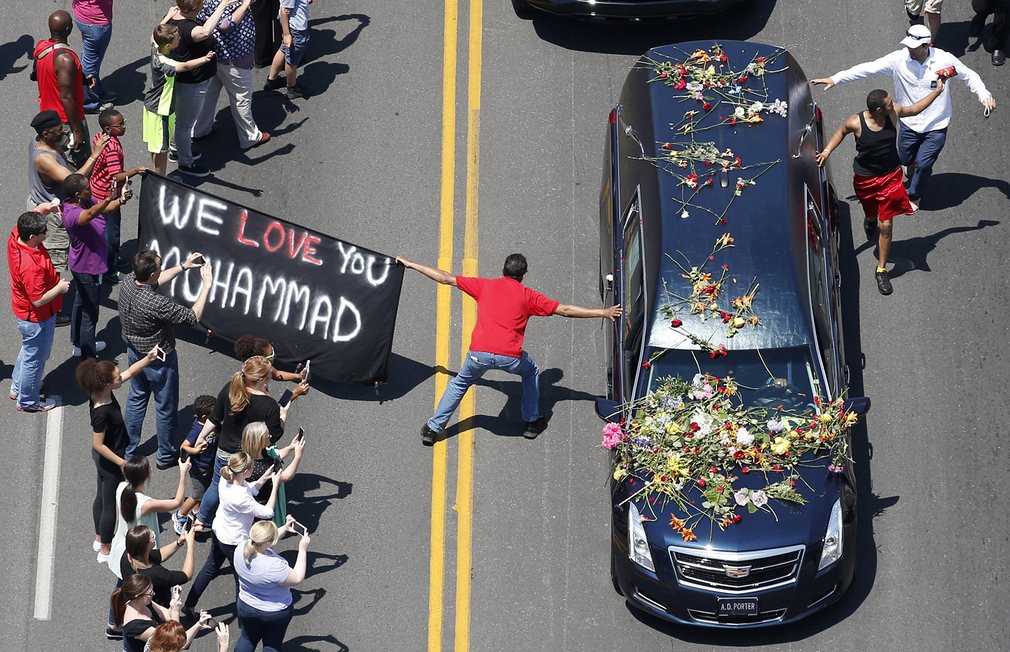 Un hombre que sostenía un lienzo se acerca al auto que transporta los restos de Muhammad Ali durante la procesión funeraria en Louisville, Kentucky