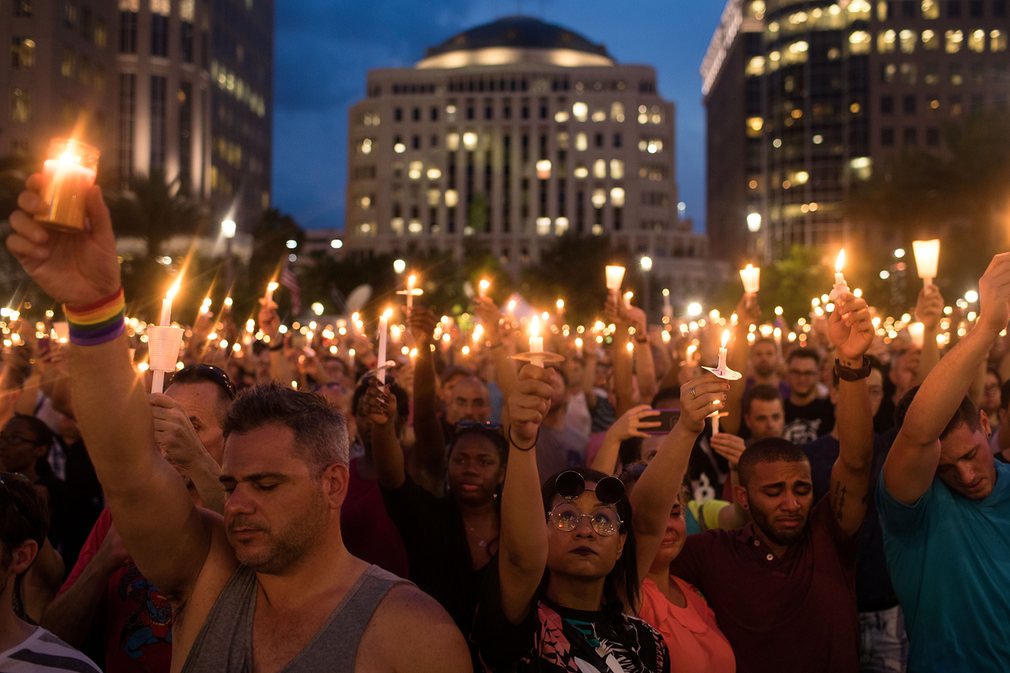 Una gran multitud de personas se reúnen para recordar a las víctimas de Pulse nightclub in Orlando, Florida