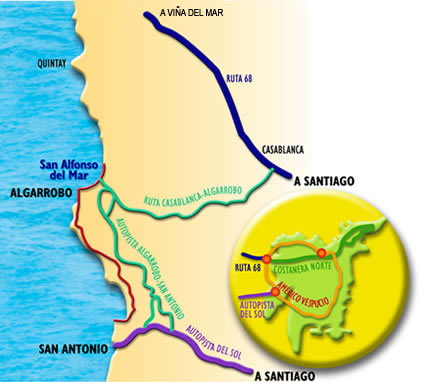 Llegar a este “mundo propio” es cada vez más rápido y seguro, ya que sus vías de acceso han sido sustancialmente mejoradas. Una de las alternativas desde Santiago es la Ruta 68 Santiago-Valparaíso –la que cuenta con doble pista en todo el trayecto–, continuando por la carretera que une Casablanca con Algarrobo. A San Alfonso se puede acceder directamente por la variante Aguas Marinas, sin pasar por el centro de Algarrobo, evitando atochamientos y demoras, en especial durante el verano. Cabe destacar que las autopistas concesionadas Costanera Norte y Vespucio Norte Express permiten llegar a la Ruta 68 en sólo minutos y sin detenciones.