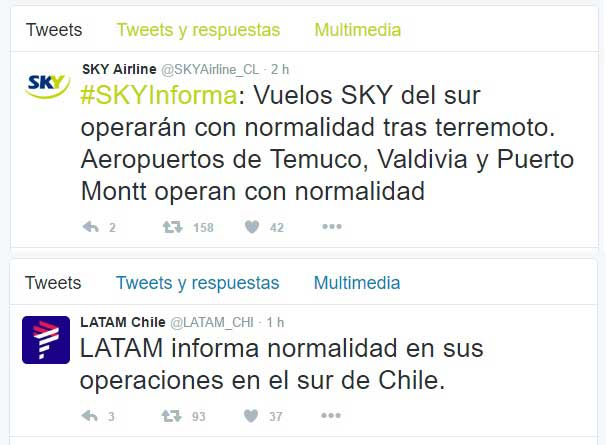 Luego del terremoto de esta mañana que ha afectado a la Región de Los Lagos, las compañías aéreas Sky y Latam informan a través de su cuenta de Twitter, que sus vuelos operarán con normalidad.
