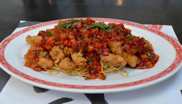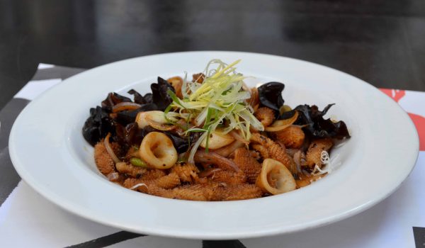 Para comenzar, propone unos sabrosos wantanes rellenos con pato asado. Luego invita a deleitarse con los Calamares al Tausi, cocinados al wok y condimentados con jengibre, wanji, cebolla y cebollín. Como platos de fondo, carne con champiñón y verduras: un delicioso filete finamente cortado, acompañado de hongos, brócoli, pimientos verdes, zuccini y cebollín, aderezado con salsa hoisin y aceite de sésamo. Además, incluye chicharrones fritos de calamar, pulpo y camarones, bañados en salsa tamarindo, piña, duraznos y pimientos, todo sobre una capa de fideos chinos.