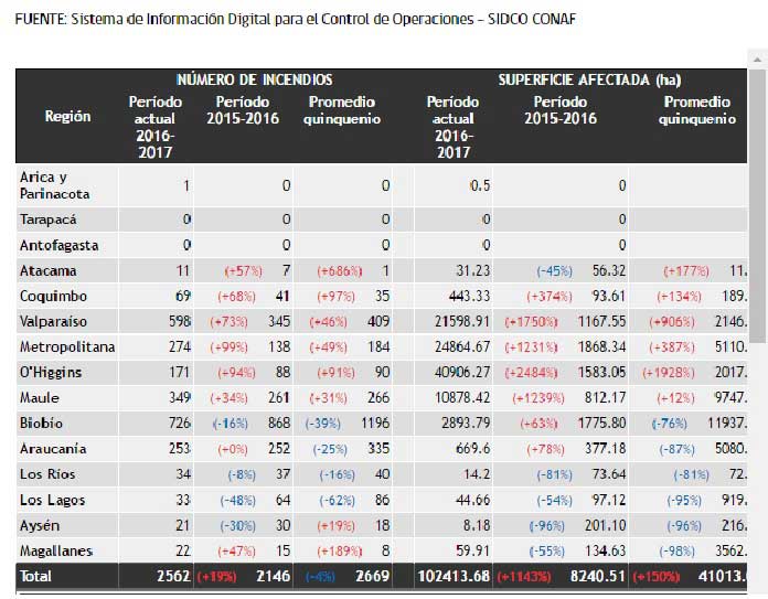Como un dato relevante para dimensionar la tragedia que se viene sobre Chile, el año pasado a esta fecha se habían quemado 8 mil 240 hectáreas. Hoy (18 enero 2017) se han quemado 102 mil 413 hectáreas lo que representa un amentos del mil 143%. Por otra parte, el número de incendios se mantiene dentro de los promedios históricos, sin presentar un aumento significativo, como sí lo ha sido la superficie destruida.