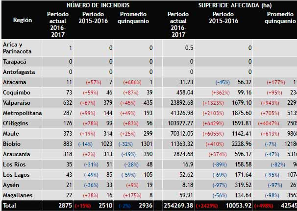 Pasadas las 21:30 horas de cada día, la Corporación Nacional Forestal, CONAF; emite un completo informe sobre la situación de los incendios forestales que están arrasando con el centro sur de Chile. Lo dramático es que se elvan a 254 mil 269 las hectáreas quemadas sin contar las decenas de casas quemadas y los miles de animales que han muerto en medio de los dantescos siniestros.