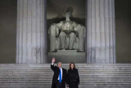 Trump bajó en compañía de su esposa, la futura primera dama Melania Trump, las escalinatas del Monumento de Lincoln, después de detenerse un momento delante de la estatua y hacer un saludo militar. «Trump, Trump, Trump», gritaban emocionados sus seguidores tras verlo bajar por las escalinatas y saludar al público.