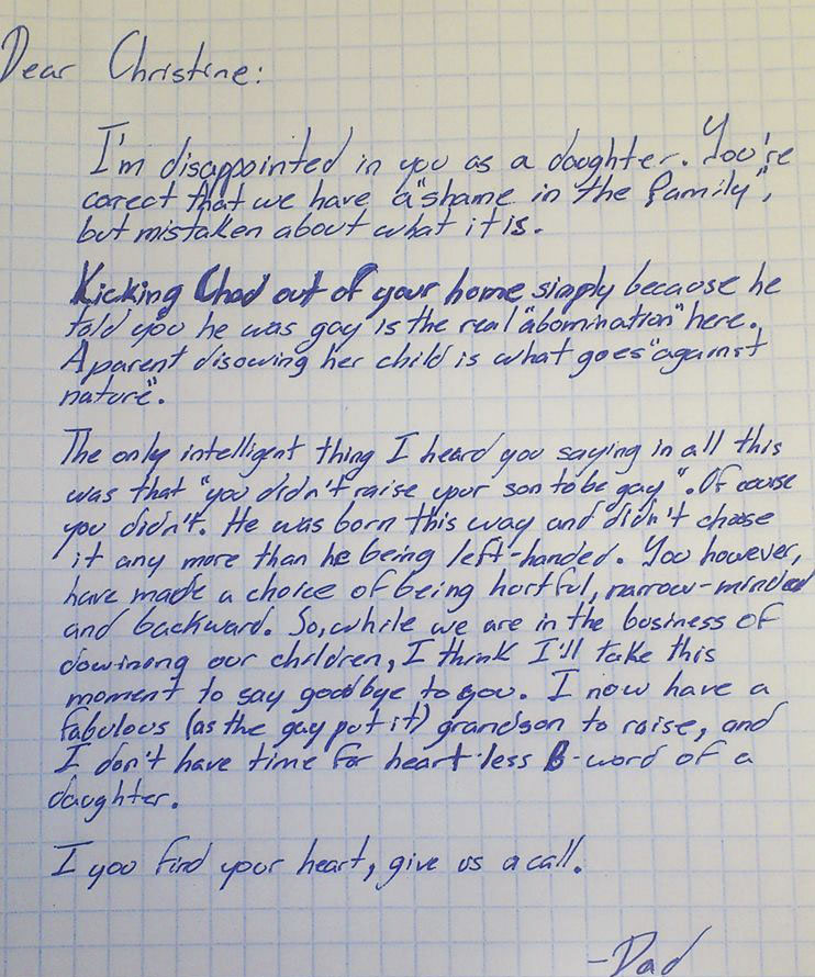 En pleno siglo XXI siguen ocurriendo hechos que ya no deberían suceder. Este el caso de una madre, llamada Christine, que decidió correr a su hijo (Chad) de la casa solo por el hecho de ser gay. Sin embargo, el abuelo le respondió con una carta en donde le entrega una lección de vida y de amor fraternal que no debe dejar a nadie indiferente.