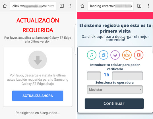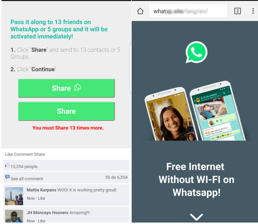 Luego de compartir la estafa, las víctimas son enviadas a sitios en donde pueden ocurrir diversos comportamientos, desde la suscripción a servicios de SMS Premium a la instalación de aplicaciones de terceros, siempre con el objetivo de otorgar un retorno económico al estafador. Las víctimas son inducidas con la idea de activar el falso servicio de Internet gratis, aunque solo lograrán ver pantallas similares a las que vemos en las siguientes imágenes:
