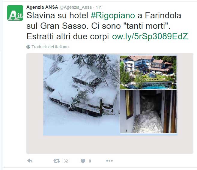El hotel ubicado en Farindola región de los Abruzos,quedo bajó un alud. El primer equipo de rescate que logró acceder al hotel lo encontró con algunos derrumbes y totalmente cubierto por la nieve. Todos sus ocupantes, unas 30 personas, podrían estar muertos, reporta ANSA y DW.
