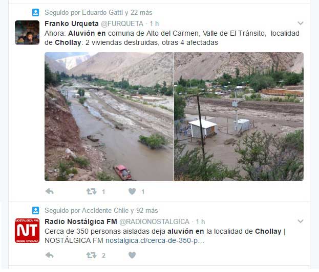 «De acuerdo a la información proporcionada por la Dirección Regional de ONEMI Atacama, en relación al desborde del Río Chollay, el cual es un afluente del Río Huasco, en el la localidad de Chollay, en la comuna de Alto del Carmen, se informa que debido a deslizamientos de sedimentos y barro, 360 personas encuentran aisladas, de las cuales 320 se ubican en la localidad de Chollay y otras 40 en el sector de El Tambo. Asimismo, se registran seis viviendas con daño mayor, mientras que otras 50 viviendas se encuentran con daños en evaluación.