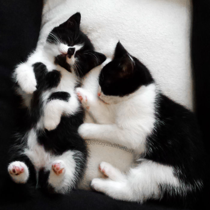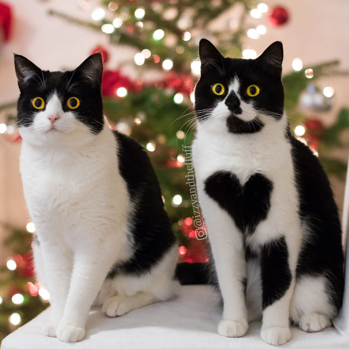 Cuando sus futuros humanos fueron a adoptar a su hermana, la gatita Zoë los hechizó para que la adoptaran a ella también. Tenía un truco: en su pecho se ve una gran marca negra en forma de corazón. Lo gracioso es que nadie se había dado cuenta antes de esta señal tan anatómicamente correcta. Sus humanos quedaron encantados y se llevaron juntas a ambas hermanas. Cuando Zoë creció, también lo hizo su pelaje y su corazón, y se ha ganado el sobrenombre de “fluff” y Reina de Corazones.