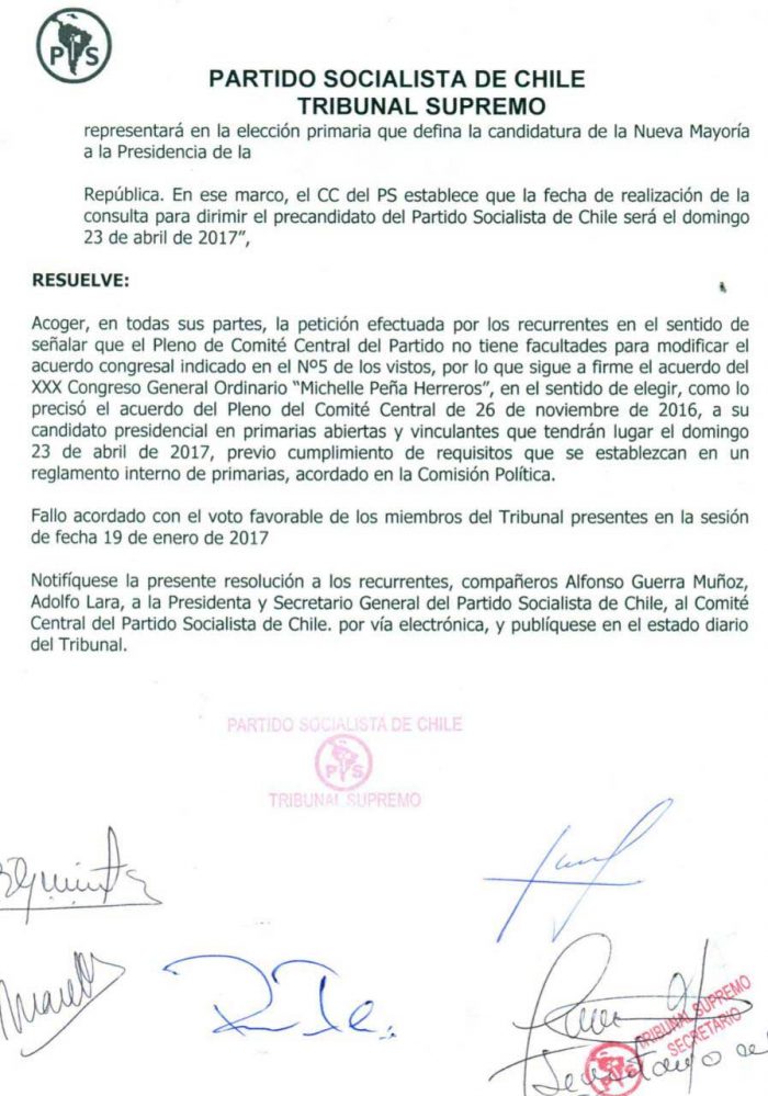 Este viernes a horas de la realización del Comité Central del PS que se realizará este sábado y que congregará a 112 miembros de esta máxima instancia del socialismo chilenos, el Tribunal Supremo del Partido Socialista de Chile emitió una resolución que claramente es un balde gélido para Ricardo Lagos y para Alejandro Guillier, ya que se determina: “Acoger, en todas sus partes, la petición efectuada por los recurrentes en el sentido de señalar que el Pleno de Comité Central del Partido no tiene facultades para modificar el XXX Congreso General Ordinario “Michelle Peña Herreros”, en el sentido de elegir, como lo precisó el acuerdo del Pleno del Comité Central del 26 de noviembre de 2016, a su candidato presidencial en primarias abiertas y vinculantes que tendrán lugar el domingo 23 de abril de 2017, previo cumplimiento de requisitos que se establezcan en un reglamento interno de primarias, acordado en la Comisión Política”.