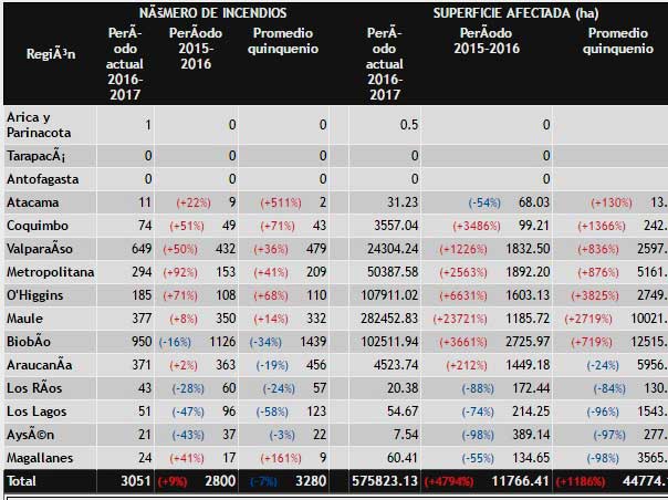 En la presente temporada (desde el 1° de julio del 2016), a la fecha han habido 3.047 incendios forestales en el país, los cuales han afectado 559.825 hectáreas y la suma total se eleva a 575.823 hectáreas arrasada por el fuego.