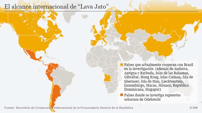 La «Operación Lava Jato”, que estalló en Brasil en marzo del 2014, ya ha provocado investigaciones en otros 40 países, según indica el Ministerio Público Federal en datos entregados a la DW. La investigación se centra en una red de corrupción y lavado de dinero que involucra a los mayores contratistas y grandes empresas de infraestructura en Brasil, a la compañía petrolera estatal Petrobras, y a numerosos líderes políticos latinoamericanos.