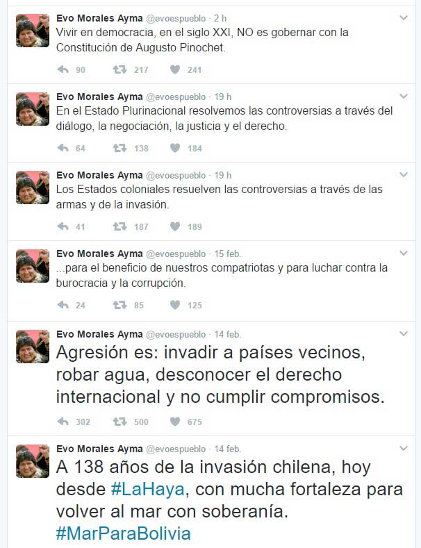En las últimas 24 horas el Mandatario boliviano ha roto todos los limites de su trato hacia Chile y ahora lo acusa de «Estado colonial»: «Los Estados coloniales resuelven las controversias a través de las armas y de la invasión», escribió en su cuenta twitter el mandatario socialista, que visitó en las últimas horas La Haya, sede de la Corte Internacional de Justicia (CIJ), donde Bolivia busca resolver un centenario diferendo marítimo con Chile.