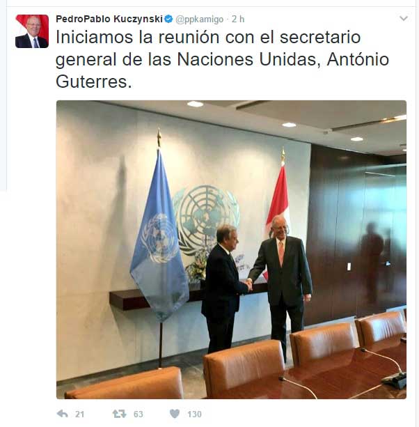 Durante la mañana de este viernes el Mandatario peruano se reunió con el Secretario General de la ONU con quien «Dialogaremos sobre el rol de liderazgo del Perú en latinoamérica, el ingreso al Consejo de Seguridad y la implementación de la agenda 2030», escribió PPK en su cuenta de Twitter.