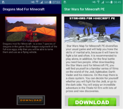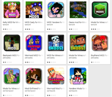 En la primera categoría se descubrieron 14 aplicaciones que se hacen pasar por mods de Minecraft y que alcanzaron hasta 80.000 instalaciones. Este troyano utiliza un componente adicional para abrir anuncios fuera de la aplicación, que actúan como un módulo supuestamente necesario para instalar los mods. Al no tener ninguna funcionalidad real y mostrar anuncios agresivos, las aplicaciones no son tan populares entre los usuarios lo que queda evidenciado por las bajas calificaciones y los comentarios negativos en Google Play.